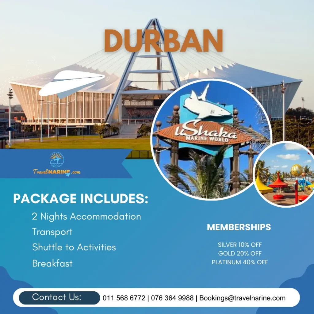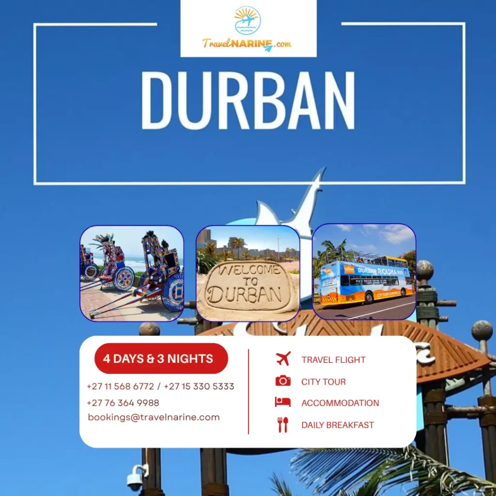 DURBAN EXPERIENCES: Ushaka Marine World, Aliwal Shoal, Blue Horizons Horse Trails, Durban City Walking Tours, Durban Ice Arena, Farm on 3 Lello Road, Garys Horses, Giba Gorge, Highstakes Venue, Krantzkloof Nature Reserve, moses Mabhida Stadium, Nature Trails Umhlanga, Bus City Tour, Rickshaw Rides, Sharks Board, Splash Waterworld, Umhlanga Pier, Wilson’s Wharf, Home Stays By Vuka Africa, Umgeni River Bird Park, Durban Natural Science Museum, Mitchell park zoo, Oceans Mall, Virtual Reality Zone, Durban Beach Front.