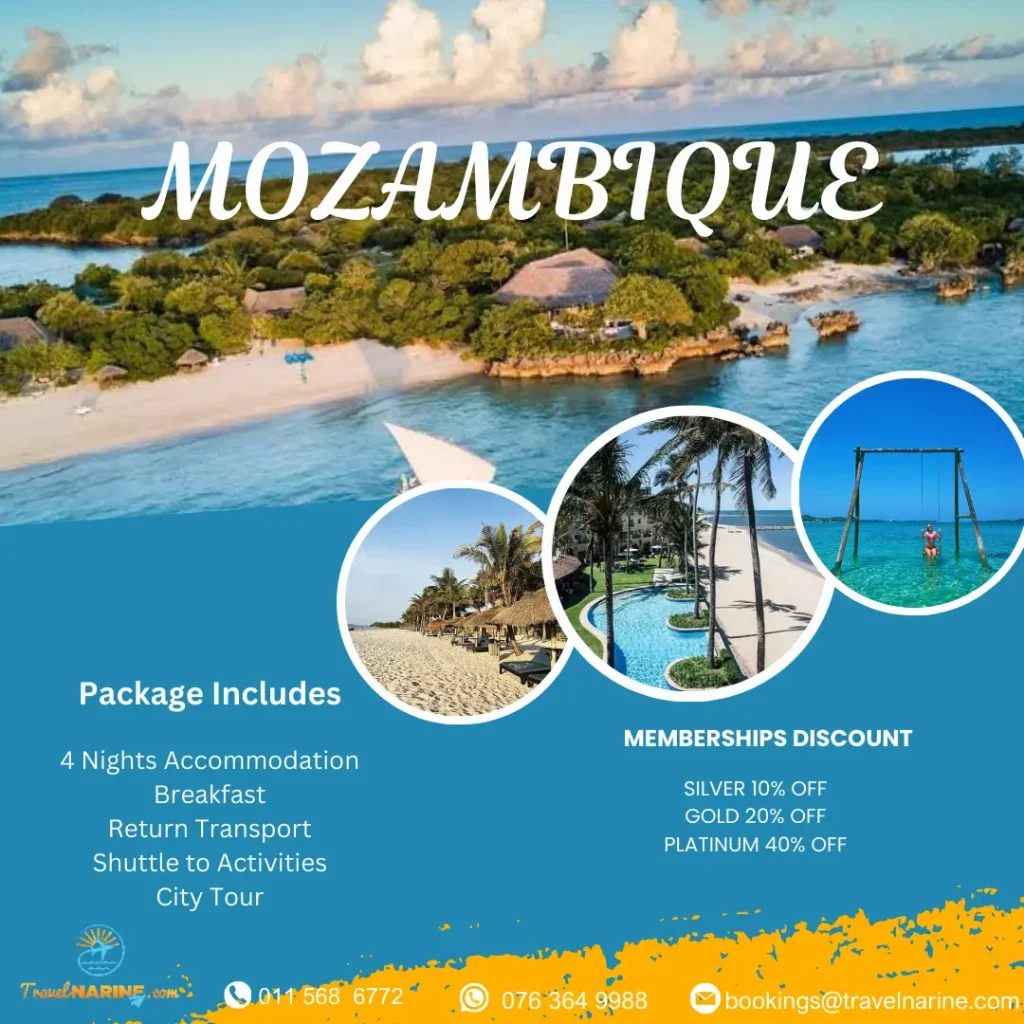 Mozambique Experiences: Gorongosa National Park, Maputo special Reserve, Maputo railway Station, Inhaca Island, Maputo, Tofo Beach, Central Market, Praia Do Bilene, Bazaruto Archipelago, Island of Mozambique, Barra Beach.